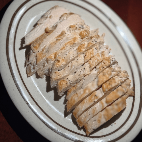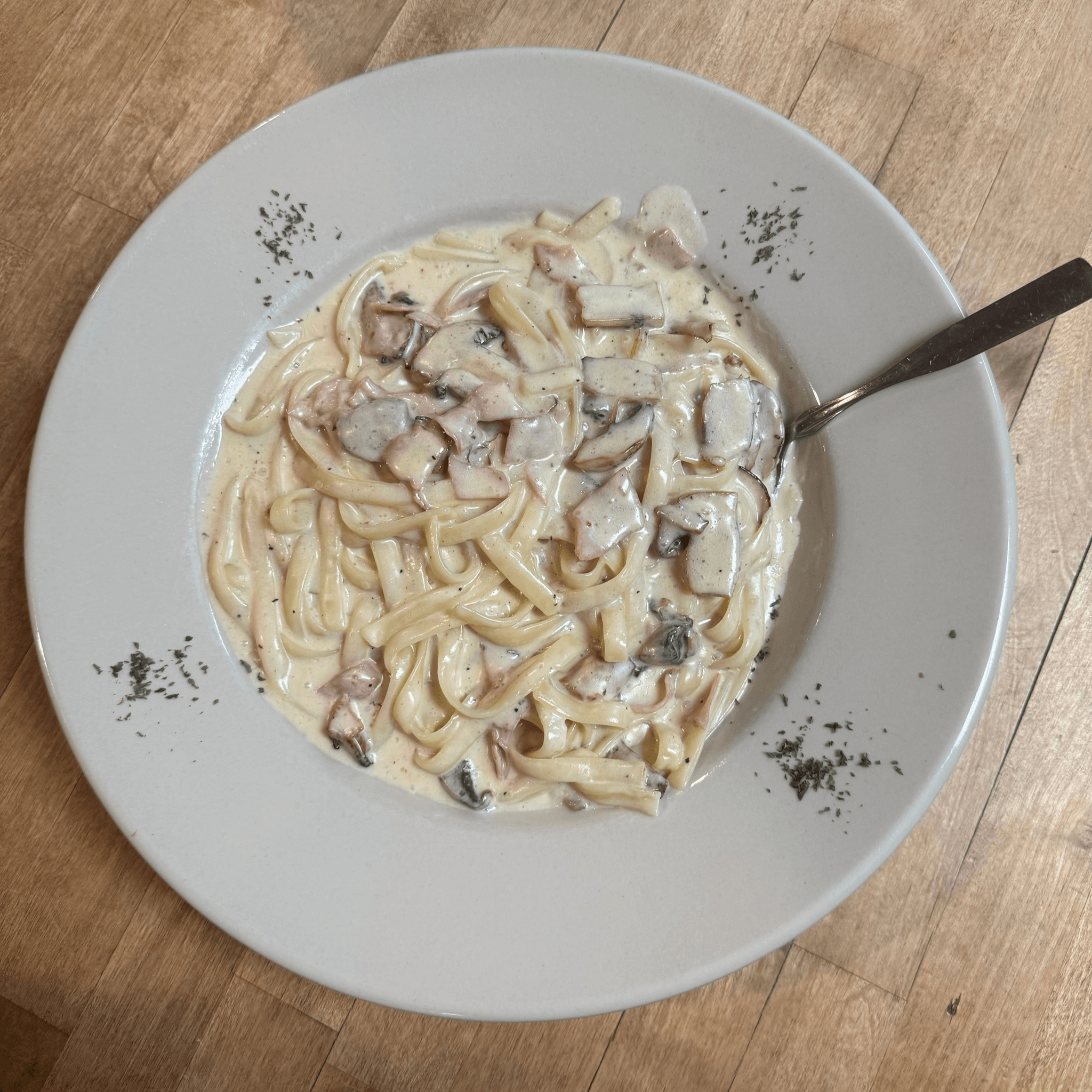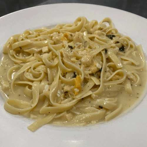 chicken breast and fettuccine pasta in a rich and creamy house mad Alfredo sauce