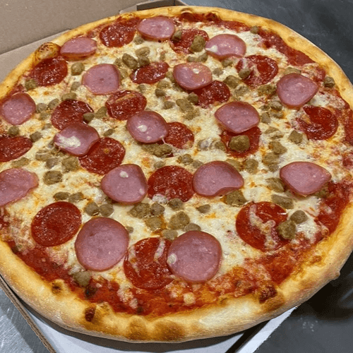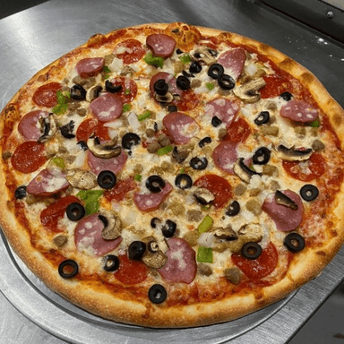 Pepperoni Sausage Canadian-Bacon Hamburger Black Olives Mushrooms Onions Green Bell Peppers