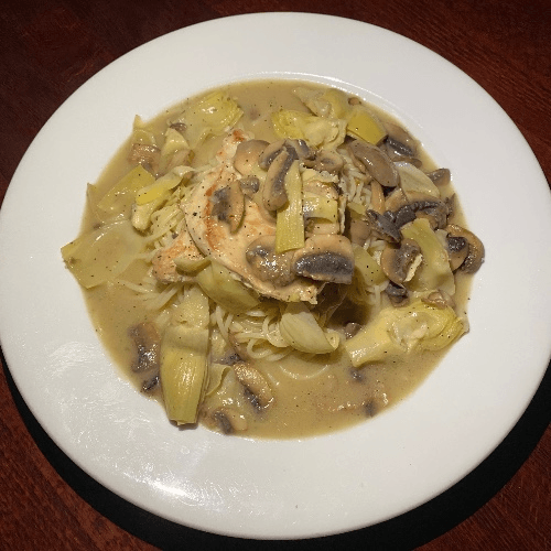 Brandy pink sauce with mushrooms artichokes, and red peppers