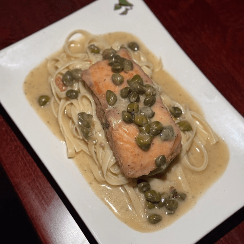 Salmon filet sautéed with white wine lemon sauce and capers over linguine