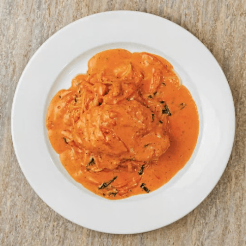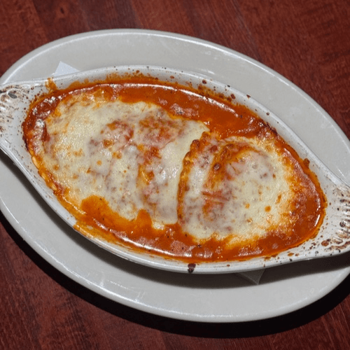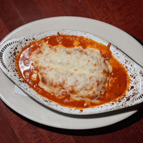 Baked jumbo ravioli, mozzarella and parmesan cheese in an alfredo sauce with a touch of marinara topped with seasoned bread crumbs