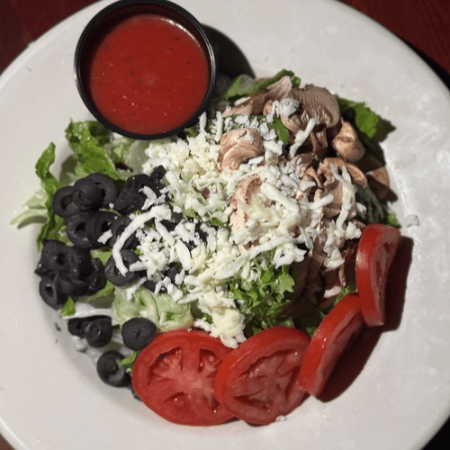 Lettuce, tomatoes, black olives, mushrooms, and mozzarella cheese served with our house vinaigrette