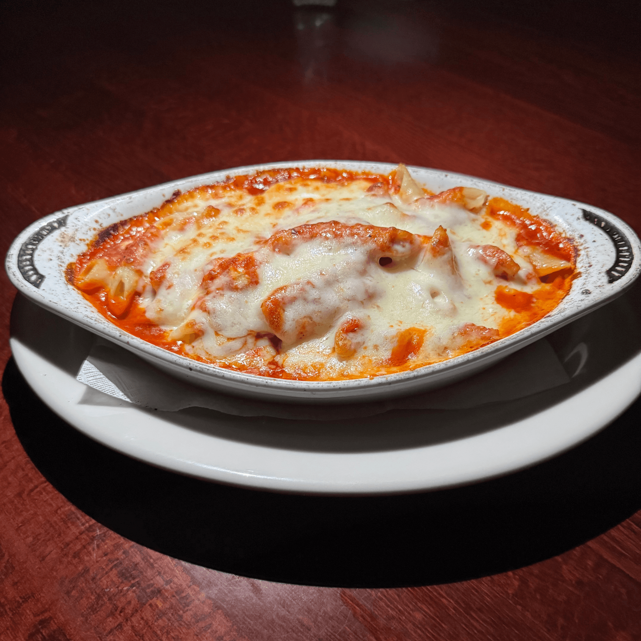 Ravioli tossed with our marinara sauce and baked with mozzarella cheese
